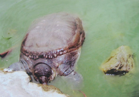 Chiều 9-4-2010 một cá thể rùa mai mềm đã nổi ở khu vực đền Ngọc Sơn. Chị Hồng Phong người chụp ảnh dạo ở khu vục đền Ngọc Sơn đã cung cấp cho chúng tôi bức ảnh chị chụp được khi cá thể rùa mai mềm này nổi sát bờ kè đình Trấn Ba. Rùa mai mềm có kích thước mai tương đối lớn 0,45 X 0,6m, chân có móng sắc, mầu trằng, mai phía trước có nhiều nốt sần.