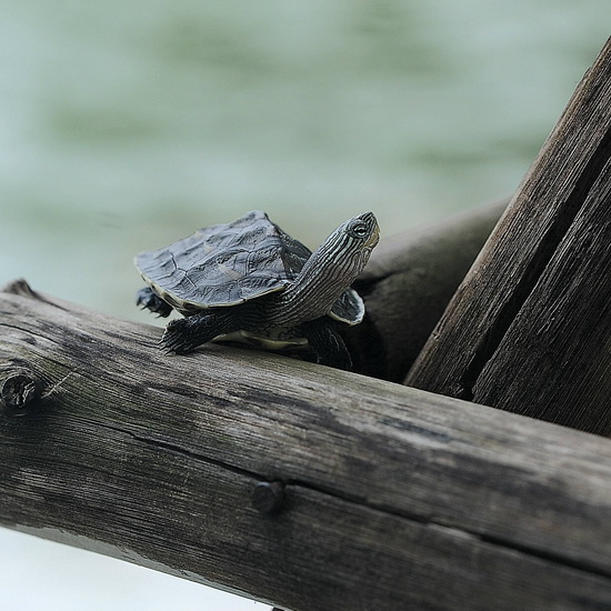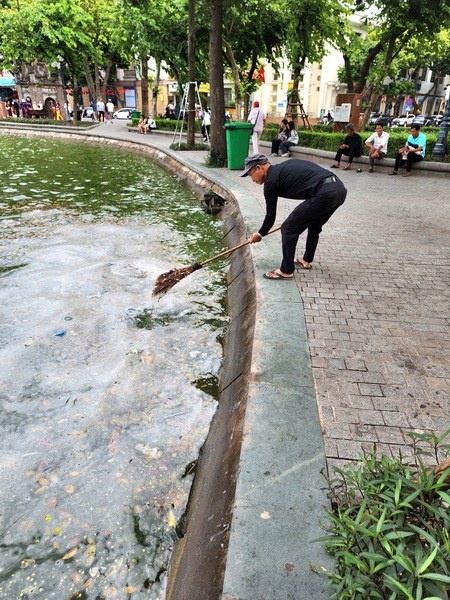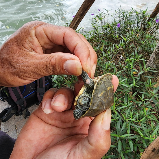 Nhưng hôm nay thì khác, hoa, máy ảnh, ba lô đặt dưới đất, anh đang mải  làm mội việc khác. Anh cầm cây chổi vớt cái gì đó trên đám bọt trắng xóa. Đến gần thì tôi được biết anh đang vớt những con rùa đá nhỏ, sau đó bỏ chúng vào một túi ni lông đặt ở gốc cây. Loài này thường được gọi là rùa đá Pond Trung Quốc thuộc họ Geoemydidae, có ngồn gốc từ Trung Quốc, Nhật bản, Hàn Quốc.