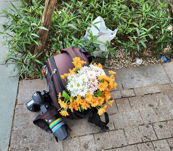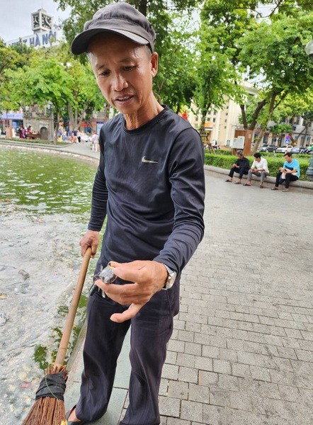 Sáng 27-10-2025, đi đến chỗ đồng hồ thủy tinh phố Hàng Khay tôi nhìn thấy anh thợ ảnh Hanh. Anh chụp ảnh dịch vụ ở khu vực này hằng chục năm. Sở thích của anh là mặc quần áo quân đội, vai đeo ba lô. Dạo này trên ba lô còn vài bó hoa nhựa để làm đạo cụ cho người thích chụp ảnh Hồ Gươm với hoa.