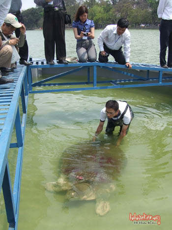 Ngày 7-4-2011, theo thông tin từ Sở Khoa học và Công nghệ Hà Nội trong ba ngày qua, tổ chữa trị vết thương cho “Cụ Rùa” hồ Hoàn Kiếm đã triển khai công việc tại khu vực Tháp Rùa từ ngày 4-4-2011 đến nay. Ngày 4-4-2011, sau khi “Cụ Rùa” được đưa vào bể chữa trị đặt ở chân Tháp Rùa được một đêm, tổ chữa trị đã tiến hành tiếp cận “Cụ Rùa” để thực hiện các công việc cần thiết.