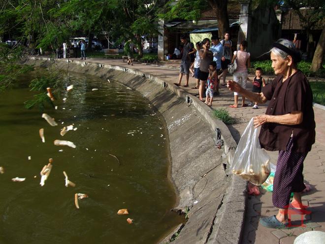 Chiều 26-5-2013, không khí chung quanh hồ Hoàn Kiếm ngột ngạt, nhiệt độ ngoài trời khoảng 38-39 độ C. Ai ngồi chung quanh hồ hóng mát cũng phải cầm chiếc quạt. Bà Quốc Thị Gái nhà ở số 46 ngõ Phất Lộc không quan tâm khí hậu nóng bức. Bà chỉ quan tâm tới việc đi xin bánh mì ở các nhà hàng, quán ăn mang cho cá ở hồ ăn. Bà làm công việc này đã hằng chục năm.