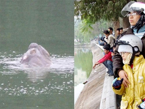 Vết thương trên lưng cụ rùa có thể do ống nước gây nên (ảnh trái) | Người bốn phương xem cụ rùa nổi ở Hồ Gươm (ảnh phải). Ảnh: Hà Hồng.