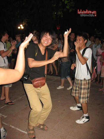 Tối 16-7-2011, sau ca trực, chúng tôi đi bộ quanh hồ. Vì là tối thứ 7, cho nên lượng người đổ về hồ rất đông. Nhiều người đến hồ để hóng mát, ăn kem, uống nước và đi bộ tập thể dục. Có người đi chợ đêm ở phố Hàng Ngang, Hàng Đào về ngồi nghỉ, khoe cho nhau xem những thứ vừa mua được. Còn một nhóm người nữa mà chúng tôi gặp tại cây lộc vừng chín gốc đó là những thành viên của câu lạc bộ khiêu vũ.