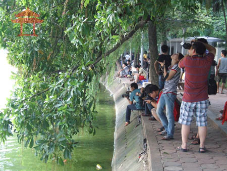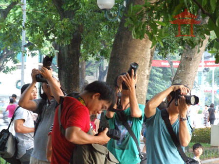 Vẻ đẹp của chuỗi hoa lộc vừng đỏ rực rỡ trong ánh nắng vàng chiếu chênh chếch trên mặt nước hồ Hoàn Kiếm xanh ngăn ngắt đã tạo nên cảnh sắc đa mầu với nhiều cung bậc đã hút hồn thợ ảnh. Thế mới có chuyện một mét vuông ...có năm ông thợ ảnh.