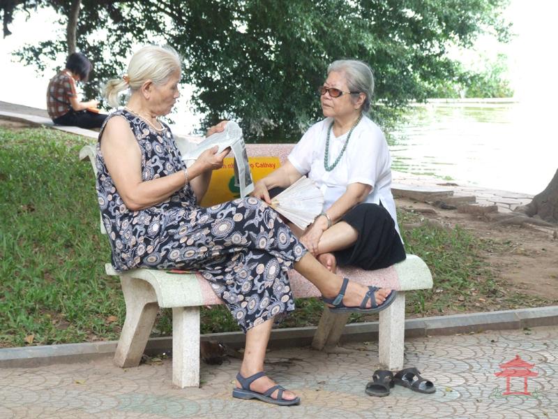 Các bác nghỉ hưu là những người thường xuyên ra hồ ngồi hóng mát. Hai vị trí các bác hay ngồi đó là khu vực đối diện báo Nhân Dân, tượng vua Lê và khu vực đối diện với cửa hàng “ Bốn mùa “. Vừa ngồi hóng mát, các bác vừa đọc báo, nghe đài, bàn chuyện thời sự. Có người mang theo cả chó cảnh và chim cảnh đi theo.