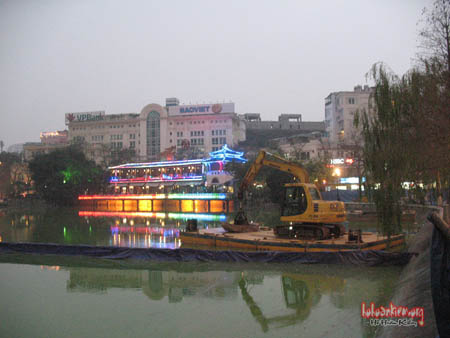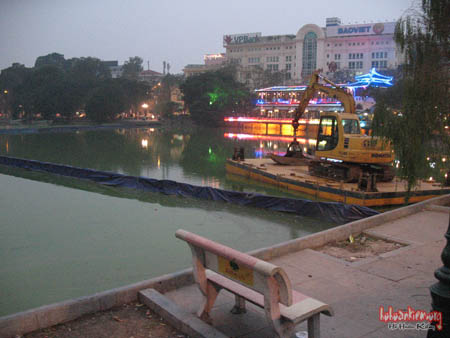 Như các bạn yêu “ hohoankiem .org” đã biết, hiện nay Công ty Thoát nước Hà Nội đang tiến hành nạo vét thủ công hồ Hoàn Kiếm. Việc nạo vét thủ công này được tiến hành chung quanh hồ tính từ bờ hồ ra 10 mét. Biện pháp này nhằm giải quyết phần lớn lượng bùn gần bờ, thu gom các tấm bê-tông, bát hương.