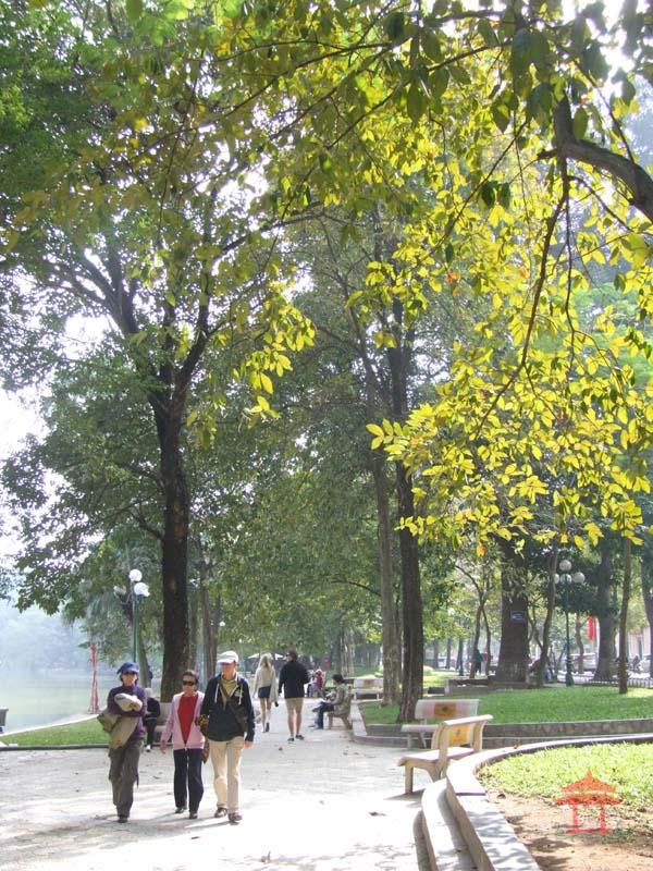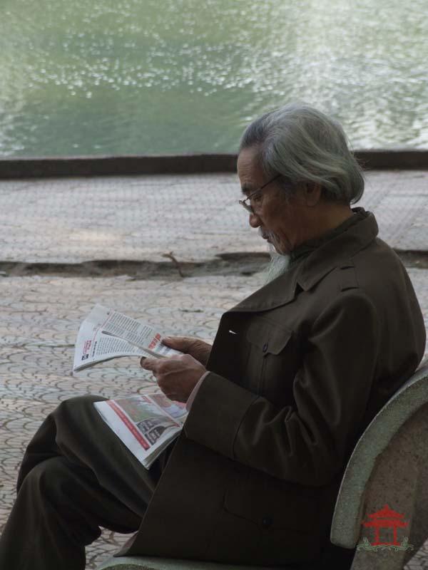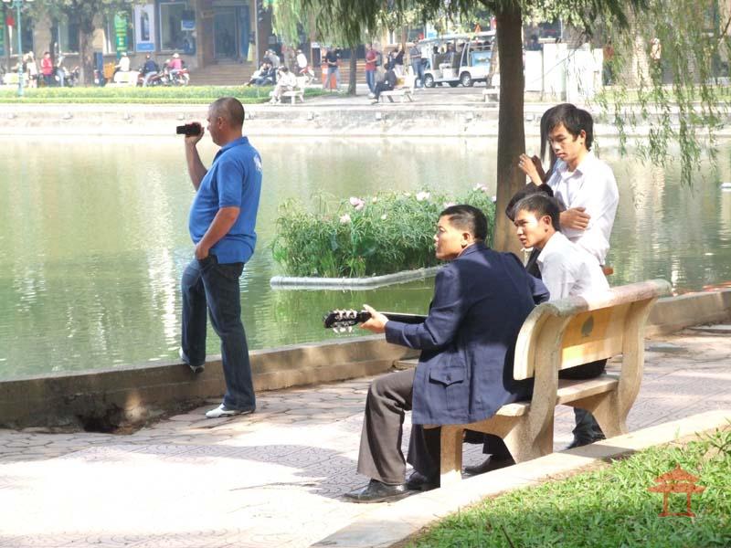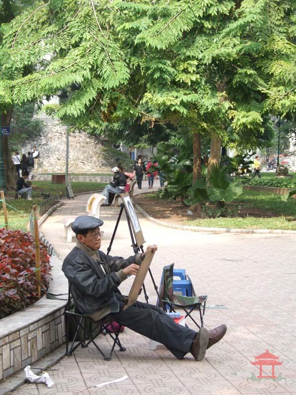 Ngày 21-12-2012, chúng tôi đi dạo chung quanh hồ Hoàn Kiếm để chứng kiến những gì đang diễn ra trong ngày tận thế. Hôm đó trời mát, nắng đẹp, không rét buốt, sầm sì như mấy hôm trước. Cụ ông vẫn ngồi bình thản đọc báo trên ghế đá. Cụ bà phóng sinh ốc xuống hồ cạnh cầu Thê Húc. Nam thanh đánh đàn, ca hát. Nữ tú khoe đường cong qua bên tháp Hòa Phong, bên cây thông nô-en. Người họa sỹ đâu cần biết “ ngày tận thế”. Anh chỉ biết đắm mình trong cảm xúc, nắng dát vàng trên từng chiếc lá.