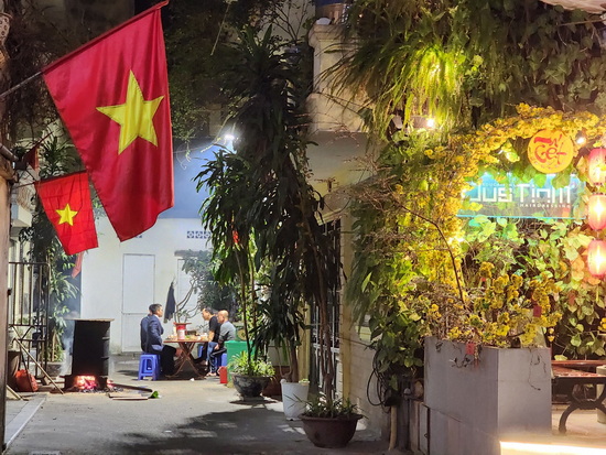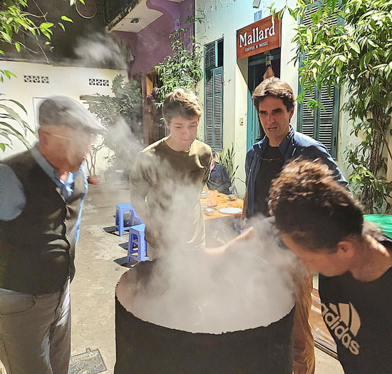Chập tối khách đến quán cà phê ở nhà số 9, thấy nồi bánh chưng sôi ùng ục, mùi của lá dong, gạo nếp, đậu xanh, thịt mỡ quyện vào khói thơm ngào ngạt cả ngõ. Điều đó tạo cảm hứng cho các vị khách chụp ảnh, quay Clip để khoe không khí Tết ấm cúng trong một ngõ nhỏ của Hà Nội với mọi người trên Fb. Một số nhà trong ngõ còn tranh thủ khều than củi để nướng hàng cân thịt rồi cho vào tủ lạnh ăn dần trong mấy ngày Tết.