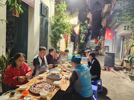 "Bàn tiệc" được kê cạnh nồi bánh chưng. Vừa bổ sung nước, củi cho nồi bánh chưng mọi người vừa nói chuyện thời sự trong ngõ (nhà này mới đến, nhà kia mới chuyển đi...), công việc của mỗi người trong năm vừa qua. Thành phần của nhóm chúng tôi rất đa dạng, người từng làm doanh nghiệp, du lịch, nhà báo, công an, bộ đội, đại biểu Quốc hội, tổ phó, bí thư chi bộ tổ dân số...Một thành phần không thể thiếu trong bữa tiệc là anh Mạnh công an theo dõi khu vực mà chúng tôi hay gọi là công an hộ tịch. Anh đến vui với chúng tôi nhiều năm nay. Ngõ chúng tôi năm nay có nhiều cái mới, đường dây điện, cáp viễn thông đặt ngầm dưới đất, không còn "mạng nhện" chằng chịt trên trên đầu. Cột điện bê-tông bị loại bỏ, thay vào đó là cột treo đèn bằng sắt nhỏ,thanh thanh mảnh. Đường được đổ bê - tông hơn một năm trước. Ngõ phong quang sạch đẹp nhờ hàng tuần các hộ dân thay nhau quét và có ý thức giữ gìn vệ sinh chung như đổ rác đúng giờ của các hộ dân. Có hộ dân chuyên để xe ngang tàng chiếm hết cả lối đi trong ngõ, bật ka-rao-ok hết cỡ để bắt hàng xóm nghe giọng hát ngang như cua đã chuyển đi nơi khác. Cửa hàng bán đồ Si da cao cấp, thu hút nhiều bạn trẻ, sinh viên, cả khách nước ngoài đã đóng cửa. Quán cơm chay Vị Lai lúc nào cũng đông khách, người ra người, người vào nườm nượp, nay đã chuyển đi nơi khác làm cho ngõ trở lại cảnh yên tĩnh như thời bao cấp. Ngõ tôi được nhiều đại gia săn lùng mua nhà vì có địa thế đẹp kiến trúc Pháp. Một, hai số nhà đã bán với giá cao ngất ngưởng, đang che bạt, "hứa hẹn" ra Tết ngõ sẽ ồn vì tiếng búa phá bê - tông, phá nhà cũ để xây biệt thự mới.