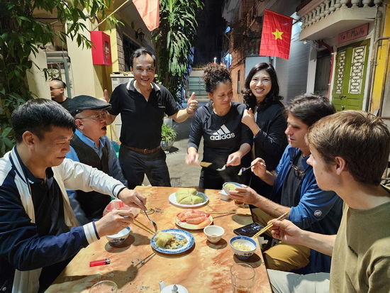 Có hai bố con ông tây đi du lịch lạc vào trong ngõ, thấy một cái nồi to đặt giữa ngõ. Họ rất thích thú khi biết các gia đình đang chung nhau nấu bánh chưng. Anh Kiên đã mời họ quay trở lại vào lúc 23h30 để xem cảnh vớt bánh chưng. Đúng giờ hẹn hai bố con người khách du lịch quay lại. Người bố tên là David Sherman người con tên là Maël Sherman. Họ là người Anh nhưng bố sốngp ở Mỹ còn con sống ở Pháp. Chị Thủy vợ anh Phong tổ phó nhanh nhẹn vớt chiếc bánh chưng đầu tiên mời họ ăn, anh Quân mời họ uống rượu Táo mèo xuất khẩu.