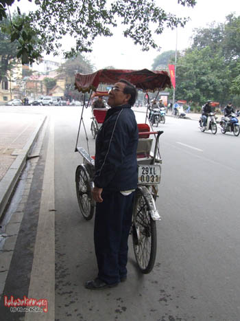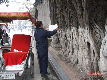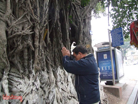 Cuối tháng 12-2010, chúng tôi bắt gặp một người đàn ông ngoài 70 tuổi, đạp xích – lô, đến thắp hương ở cây đa đình Cổ Vũ (phố Hàng Gai) . Ngày 10-1-2011, khi đang ngồi nói chuyện với ông khắc bút bên đền Bà Kiệu, chúng tôi lại gặp người đàn ông đó đạp xe xích – lô đến thắp hương cho cây đa cạnh đền.