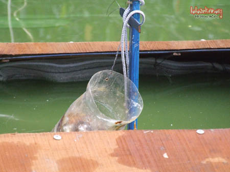 Thức ăn nhử rùa tai đỏ được đặt trong các hộp nhựa, chai nhựa không tiếp xúc trực tiếp với nước