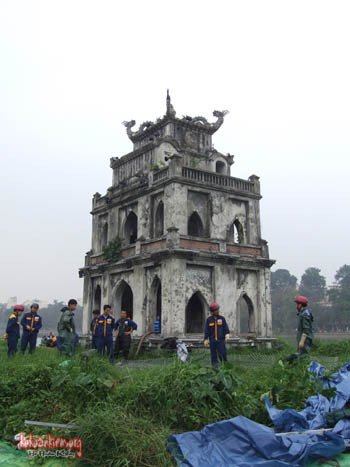 Ngay sau khi đồng chí Chủ tịch UBND TP Hà Nội quyết định phương án chữa vết thương cho Cụ Rùa tại khu vực hồ Hoàn Kiếm, ngày 25-2-2011, Sở Xây dựng triển khai việc dọn dẹp vệ sinh chung quanh chân tháp, đắp bao cát và tạo đường dẫn cho Cụ Rùa lên tháp
