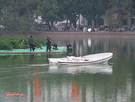 Bao cát được vận chuyển từ vị trí hồ đối diện với Intimex, ra Tháp Rùa bằng thuyền kéo dây
