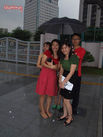 Nam dặn, xe không đỗ được trước cổng cung vua, dù là chốc lát, do vậy mọi người phải sang phía cổng liên bộ ở bên cạnh. Trong cơn mưa chúng tôi phải sang đường. Không ai có ô. May sao các bạn Hàn Quốc cùng sang đường cho trú nhờ. Thế là chúng tôi tự chia nhau ra đi nhờ ô của khách qua đường.