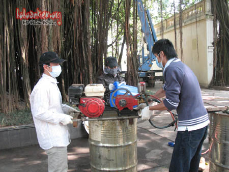 Tuy vậy vẫn còn. Mỗi lần phun thuốc như vậy tốn khoảng năm triệu đồng ( tiền mua thuốc, bồi dưỡng người phun, thuê xe nâng tầm hơn 30 m).