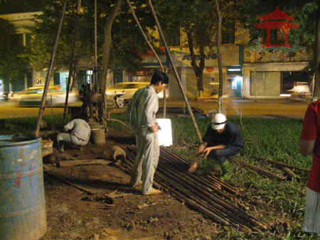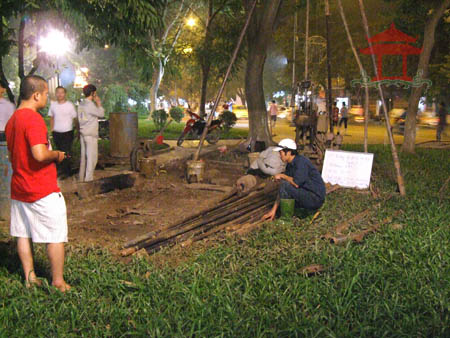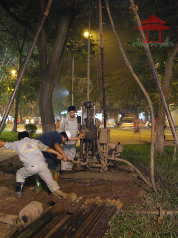 Nhiều ngày nay, đi chung quanh hồ Hoàn Kiếm chúng tôi thấy có ba dàn máy khoan đặt dọc theo phố Đinh Tiên Hoàng. Tuy vậy không thấy ai làm việc vào ban ngày. Tối 24-10-2011, lúc 20 giờ 30 phút chúng tôi đến dàn khoan đặt đối diện với Công ty Điện lực một.