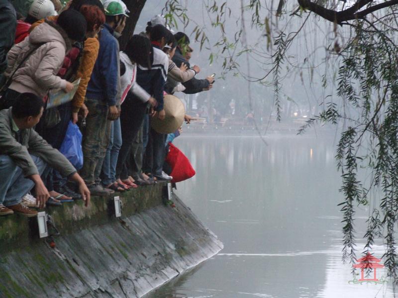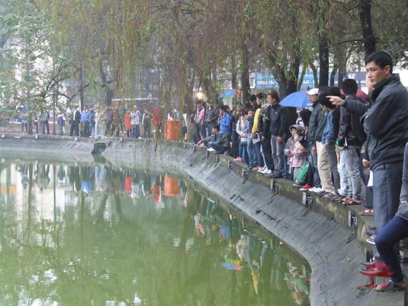 Nhiều lúc Rùa bơi sát bờ chừng 0,5 m, lộ rõ cả mai. Hằng trăm lượt người đội mưa xuân xem Rùa nổi, trong đó có khách du lịch người nước ngoài.