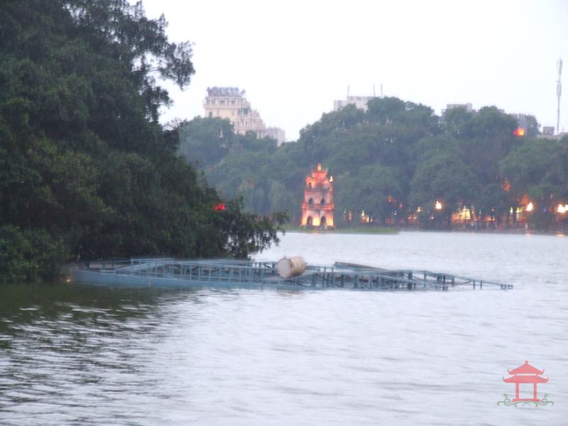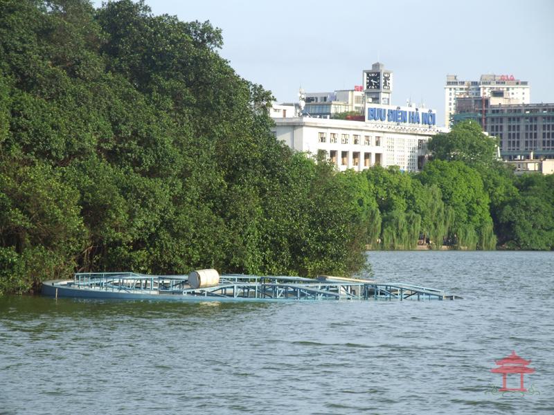 Hỏi một cán bộ của đền Ngọc Sơn, chúng tôi được biết: Khi nước hồ dâng cao sau mấy cơn mưa, neo của bệnh viện “dã chiến” bị đứt. Do vậy, Sở Tài nguyên và Môi trường thành phố phải cử người đến bơm đầy nước vào bồn, cho chìm xuống.