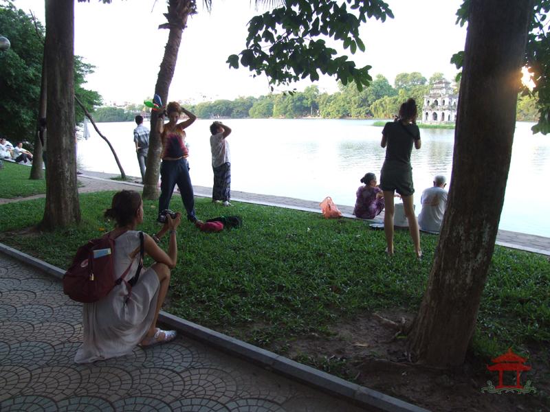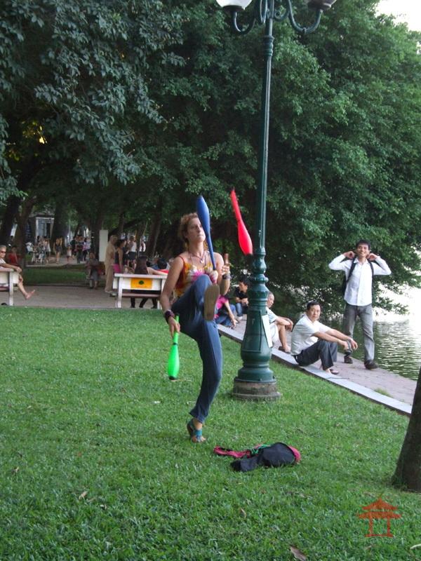 Chiều 5-8- 2012, đi đến đoạn đối diện Cửa hàng Bốn Mùa, chúng tôi thấy một cô gái trẻ tóc vàng đang biểu diễn tung hứng trên bãi cỏ. Lúc thì cô ném vật tung hứng qua chân, lúc thì qua lưng, y như các diễn viên làm xiếc vậy.