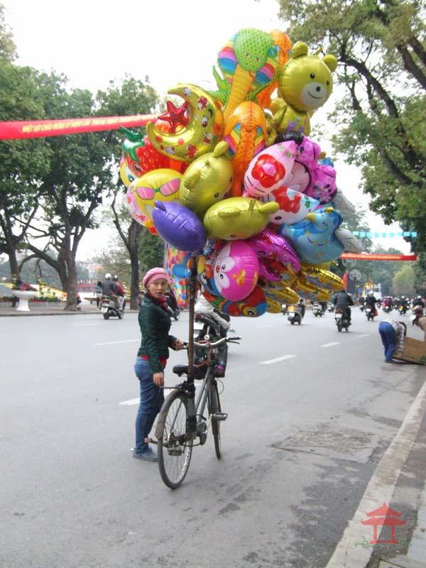 Những người bán hàng rong bóng bay đã sẵn sàng phục vụ đêm 30 Tết. Có một mặt hàng chỉ được bán rong vào ngày cuối cùng của năm đó là lá mùi già để mọi người tắm với mục đích gột rửa những bụi bặm, những điều không may mắn trong năm.