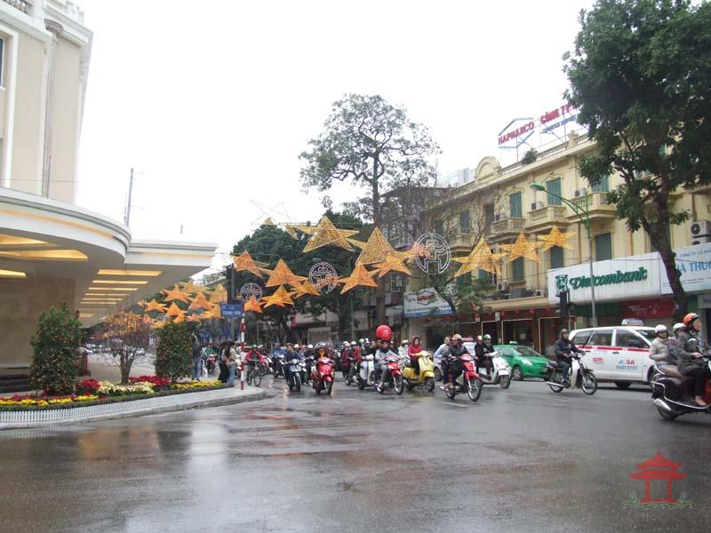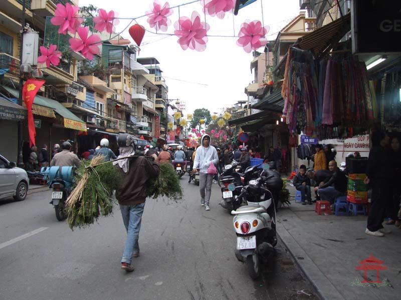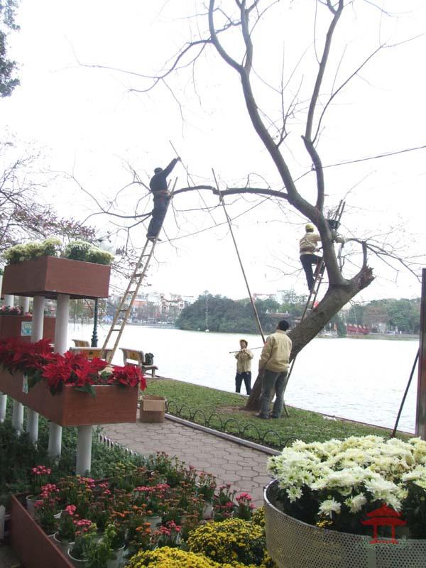 Đèn và hoa trang trí trên các con phố chung quanh hồ đã sẵn sàng cho đêm 30 Tết. Đèn sao trên phố Hàng Gai, đèn dàn nhiều hình khối trên phố Hàng Khay, hoa đào trên phố Tràng Thi, hoa đào trên phố Bà Triệu, hoa đào và hoa mai trên phố Hàng Đào.