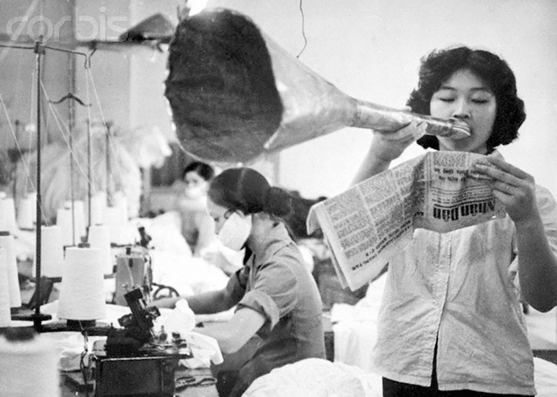 Bức ảnh người con gái đọc báo trong một phân xưởng may, tôi tìm được trên mạng Corbis có chú thích: “Công nhân Nguyễn Thị Liên, thường đọc báo Nhân Dân cho các đồng nghiệp đang trong ca làm việc tại Nhà máy dệt kim Hà Nội vào ngày 13-2-1968”.
