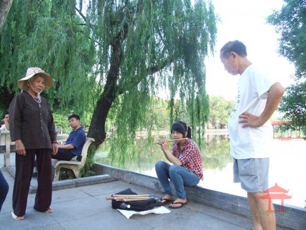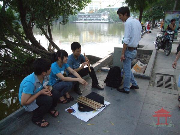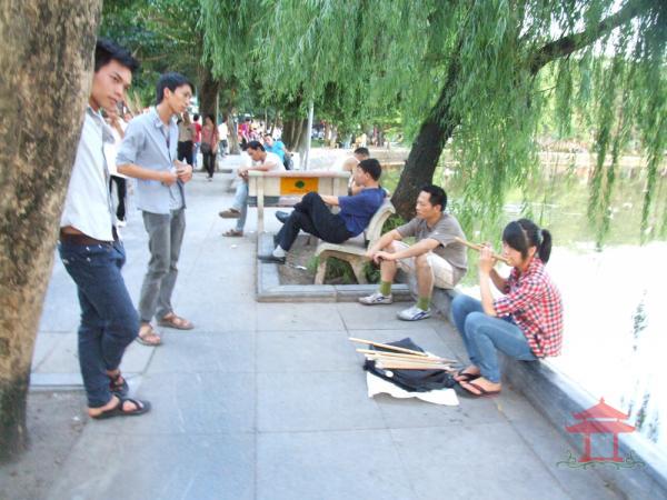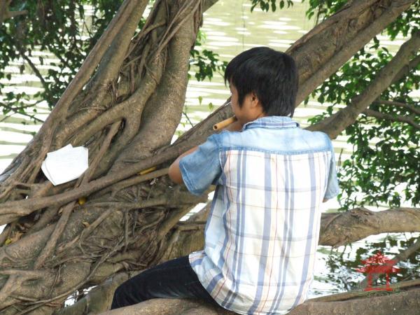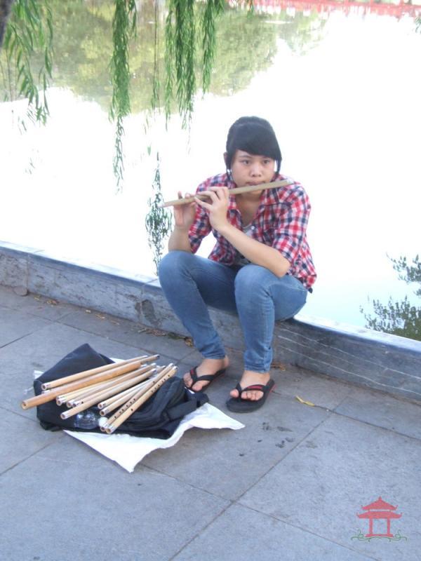 Đi qua cổng đền Ngọc Sơn, anh thổi sáo mù vẫn ngồi đó. Anh đang thổi bài bèo dạt mây trôi. Âm thanh của nó dập dềnh theo sóng hồ. Đến đoạn đầu đường đôi Đinh Tiên Hoàng tôi vẫn nghe tiếng sáo. Sao vậy ? Mọi ngày đi đến đây chúng tôi đâu có nghe tiếng sáo ? Âm thanh của nó không thanh mỏng mà lại trầm khàn. Không phải bài bèo dạt mây trôi mà là bài xuân về trên bản mông.... Đó là tiếng sáo mèo. Một cô gái rất trẻ đang ngồi thổi sáo, cạnh cây si già “nghiên hết mình ra hồ “.