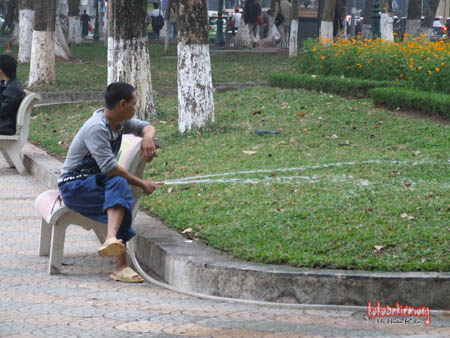 Vào cuối buổi chiều, khi nhiều người qua lại bên hồ, nhìn cảnh anh công nhân đứng, ngồi tưới nước cho cỏ, chúng ta có cảm giác như anh đang tưới cỏ tại sân nhà riêng chứ không phải giữa trung tâm thành phố. Chiếc máy bơm đã cũ, trơ cả cánh quạt, kêu cành cạch, Cảnh tượng đó làm nhếch nhác, làm xấu hình ảnh hồ Hoàn Kiếm.
