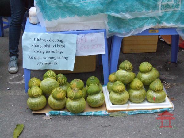 Đến chợ hoa ở phố Hàng Lược chúng tôi nhìn thấy một quầy bán hàng thu hút rất đông người đến xem. Quầy bán bưởi hồ lô. Đến gần chúng tôi được nghe cô gái bán bưởi kể về người đầu tiên tạo ra bưởi hồ lô.