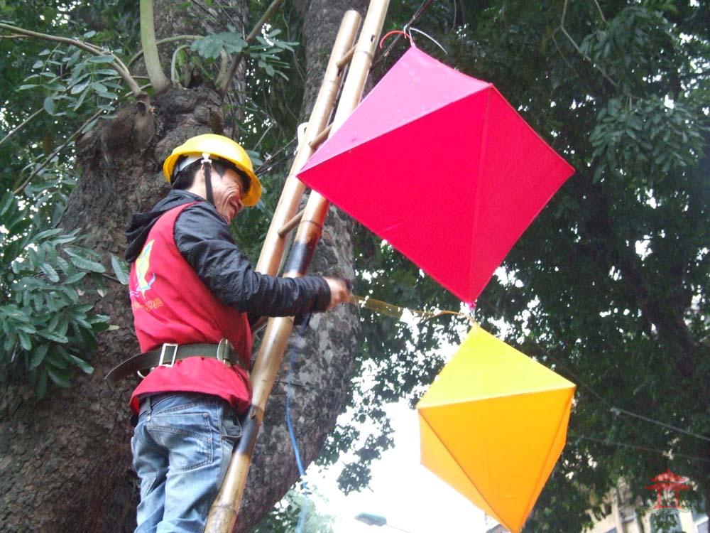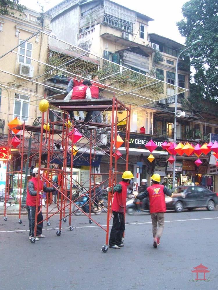 Đèn trang trí dọc theo phố Hàng Khay, đầu phố Bà Triệu, Tràng Thi đã được chăng lên với nhiều khuôn dạng phong phú: khối vuông, tròn. Đèn lồng theo hình quả trám với sắc mầu vàng, đỏ, da cam. Không thả một cách đơn giản như đoạn đầu phố Điện Biên Phủ.