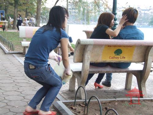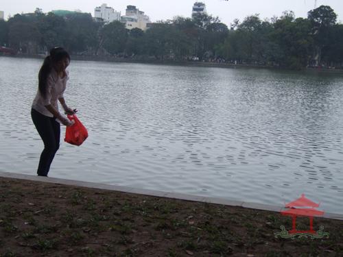 Vào chiều chủ nhật hằng tuần, chúng tôi thường thấy từng tốp bạn trẻ lặng lẽ đi nhặt rác chung quanh hồ. Họ nhặt túi ni-lông, vỏ chai nhựa, que kem, cho vào túi lớn. Thấy họ nhặt nhiều khách nước ngoài cũng làm theo; nhiều người lặng lẽ mang túi ni-lông, que kem... ra vứt vào thùng rác chứ không vứt xuống đất nữa.