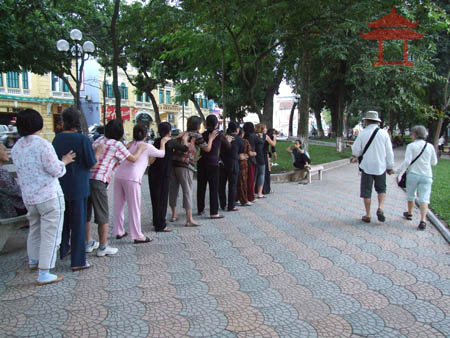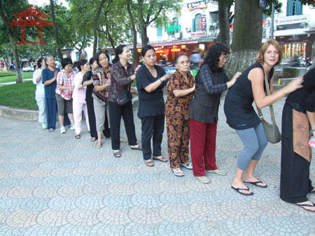 Chiều 9-11-2011, chúng tôi thấy hai cô gái đứng thành hàng với những người tập thể dục bên hồ Hoàn Kiếm đoạn đối diện với Nhà hàng bốn mùa.