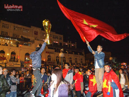 Quảng trường Đông Kinh Nghĩa Thục tối ngày 08-12-2010 sau khi đội tuyển bóng đá Việt Nam thắng đội tuyển bóng đá Sin-ga-po với tỷ số 1-0.