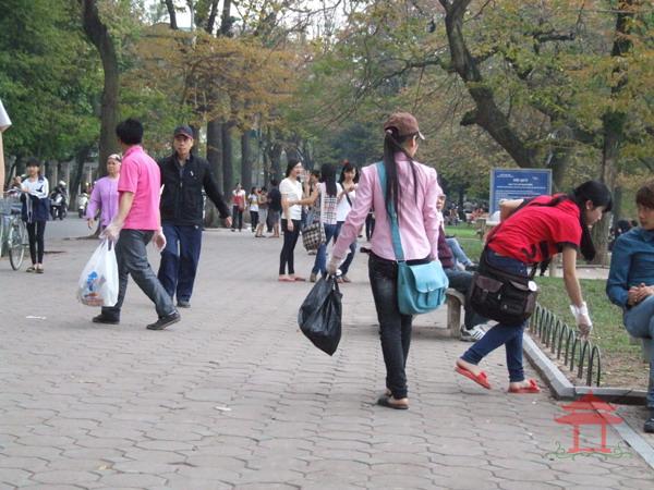Vào ngày chủ nhật, một hoạt động chúng tôi thường xuyên thấy là các bạn sinh viên của nhiều trường đại học, cao đẳng tự tập hợp với nhau thành các nhóm để đi nhặt rác. Các bạn đi nhặt một cách cần mẫn. Họ lặng lẽ nhặt các mảnh giấy kẹo, bánh trên đường đi, thảm cỏ. Việc làm đó của họ thật đẹp. Không chỉ làm sạch hè phố mà còn là hình ảnh trực quan nhắc nhở mọi người cùng có ý thức bảo vệ môi trường.