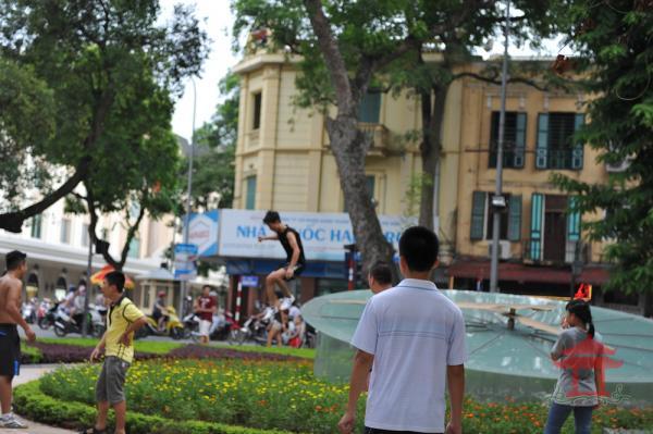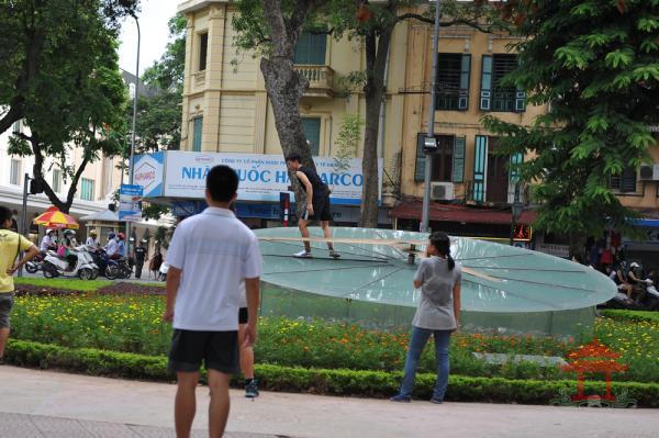 Chiều 20 -7- 2013, đi đến khu vực đầu phố Hàng Khay chúng tôi nhìn thấy một số bạn trẻ đang đá cầu cạnh chiếc đồng hồ “thủy tinh” . Ai đó đã đá chiếc cầu văng lên mặt đồng hồ “thủy tinh”.