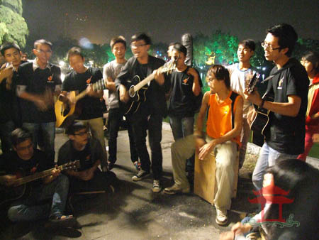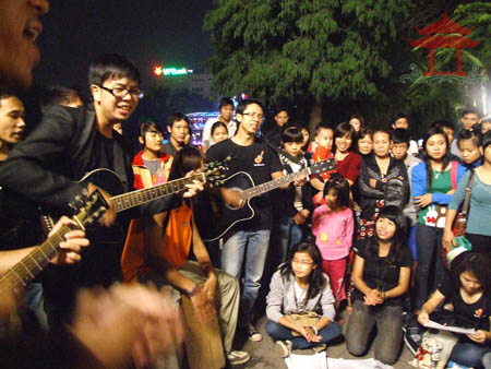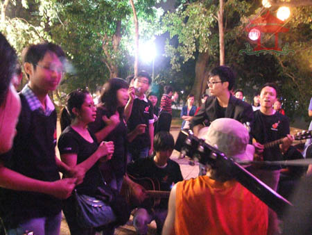 Chúng tôi hỏi một thành viên trong nhóm, sinh viên Nguyễn Quý Tiếp (Đại học Thăng Long ) và được biết: Hôm nay là tối đầu tiên nhóm tổ chức du ca chung quanh hồ Hoàn Kiếm. Khởi đầu từ tượng đài Lý Thái Tổ, sau đó chuyển đến cây lộc vừng chín gốc, Quảng trường Đông Kinh Nghĩa Thục...