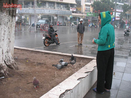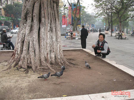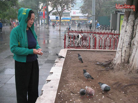 Sáng ngày 20-12-2010, trời mưa nhỏ và rét. Đi đến Quảng trường Đông Kinh Nghĩa Thục chúng tôi nhìn thấy một chị đang đứng cho chim bồ câu ăn dưới gốc cây đề. Lúc đó khoảng 7 giờ sáng.